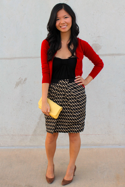 Per usual, my 9-to-5 uniform starts with a skirt, but this time with a playful geometric pattern in a neutral palette. I threw on a deep red boyfriend cardigan for a pop of color, classic closed-toe pumps, and a buttery yellow clutch.