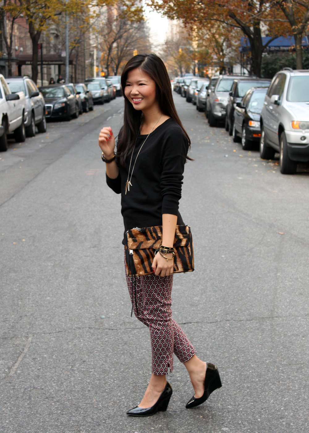 After an adventure-filled weekend with one of my best friends from Arizona, I’m back on the grind for another Monday. And while it’s always extra difficult for me to get out of bed at the start of the week, throwing on a fierce outfit is a great way to cure the case of the Mondays. Printed pants and a crew-neck sweater are perfect for work, but a tiger-print clutch and talon necklace (borrowed from my blogger besties) give the look an unexpected edge.