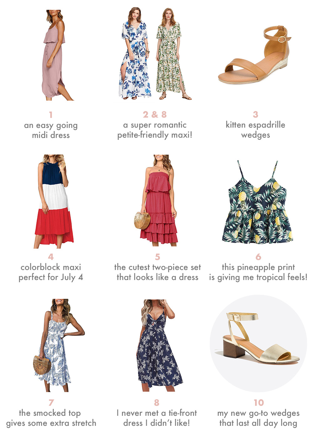 Pink Midi Dress ($23) / Blue Floral Maxi ($27) / Green Floral Maxi ($27) / Espadrille Kitten Wedge ($14) / Colorblock Maxi Dress ($22) / Two Piece Ruffle Set ($18) / Pineapple Print Peplum Top ($16) / Leaf Print Smock Dress ($22) / Navy Floral Tie Front Dress ($23) / Gold Ankle Strap Block Heels (usually on sale for about $44)